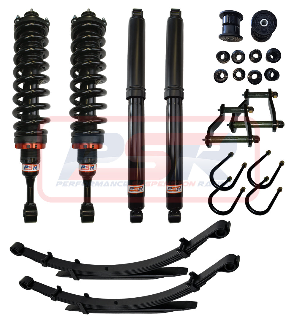 This kit contains PSR TTG front struts all pre-assembled with Kings coil springs and HD strut tops, leaf springs, U-bolts, new leaf bushes and PSR TTG rear shocks.