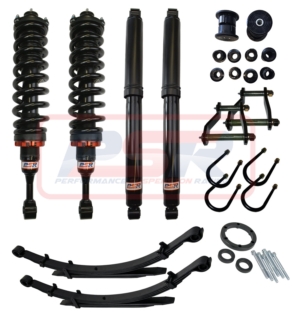 This system sits at 3" front and 2" rear to sit the car level and includes our PSR TTG height adjustable 3 - 5" struts, Kings coil and rear leaf springs, PSR TTG rear shocks, bushes, U-bolts, greaseable shackles and our PSR tailshaft spacer as some vehicles may experience a driveline vibration when taking off at low speeds once lifted. The front tailshaft is too short from factory so after lifting and fitting bigger tyres, they are prone to breaking.